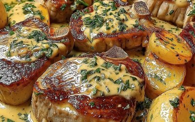 Fläskkotletter med potatis och gräddsås den perfekta maträtten där potatis lagar mat i buljong och grädde, vilket gör dem otroligt ömma.